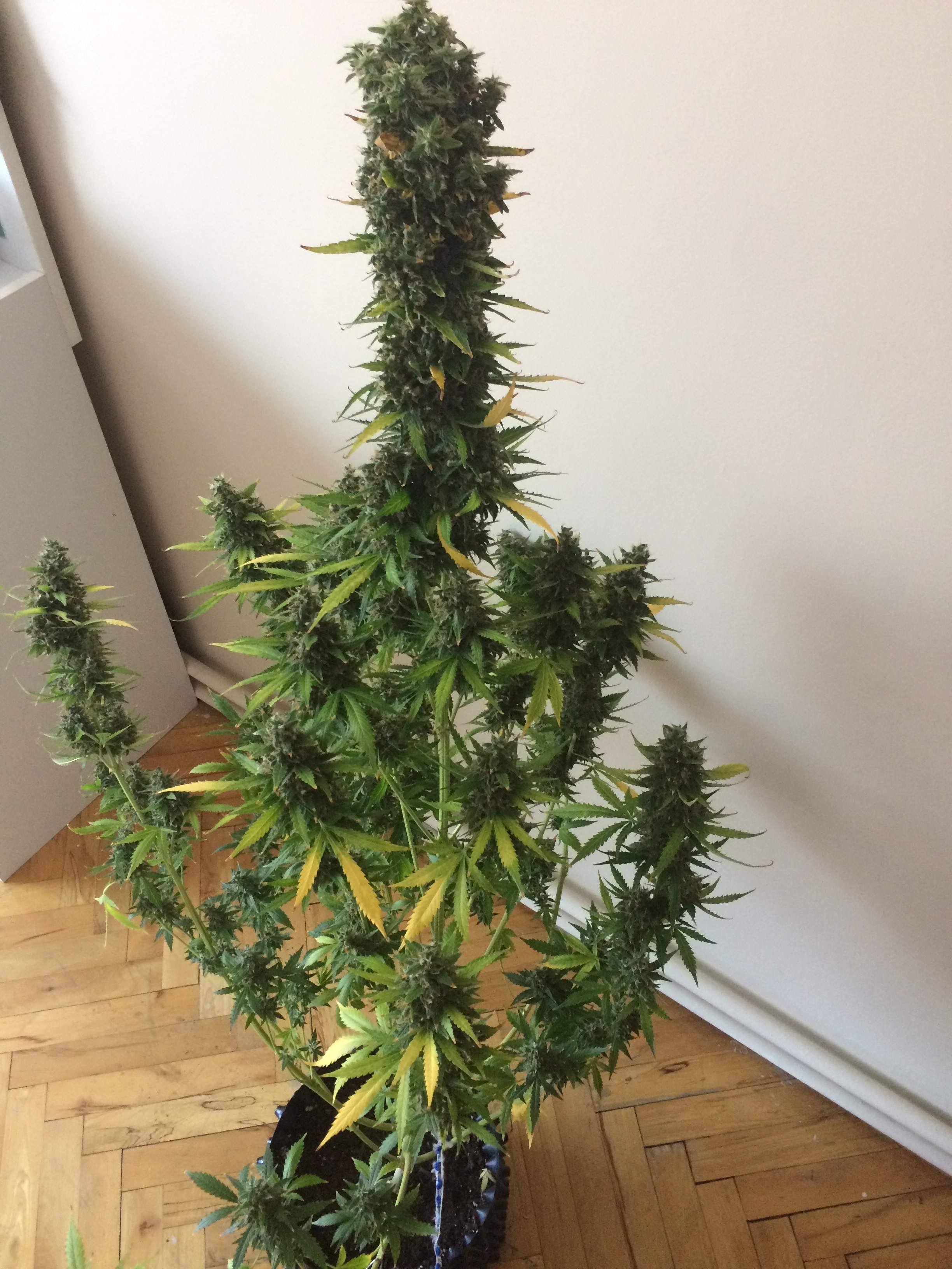 Обычный куст, вел себя хорошо, не буянил Растил под фитолампами с мощностью в сумме на 90W Земли там литров 7 Удобрял гумусом из цветочного за 150 рублей С такой мощностью ламп большего и не получится. В целом я курю часто, но понемногу. За 4 месяца употребления осталась еще половина от того что на фото. По мере роста полив дошел в итоге до 1,5 литров через день. Эта семка мне досталась вообще от друга, ей было уже года 3 к тому моменту. Я думал она не прорастет и замочил ее чисто ради интереса. В итоге пришлось снова гровить)