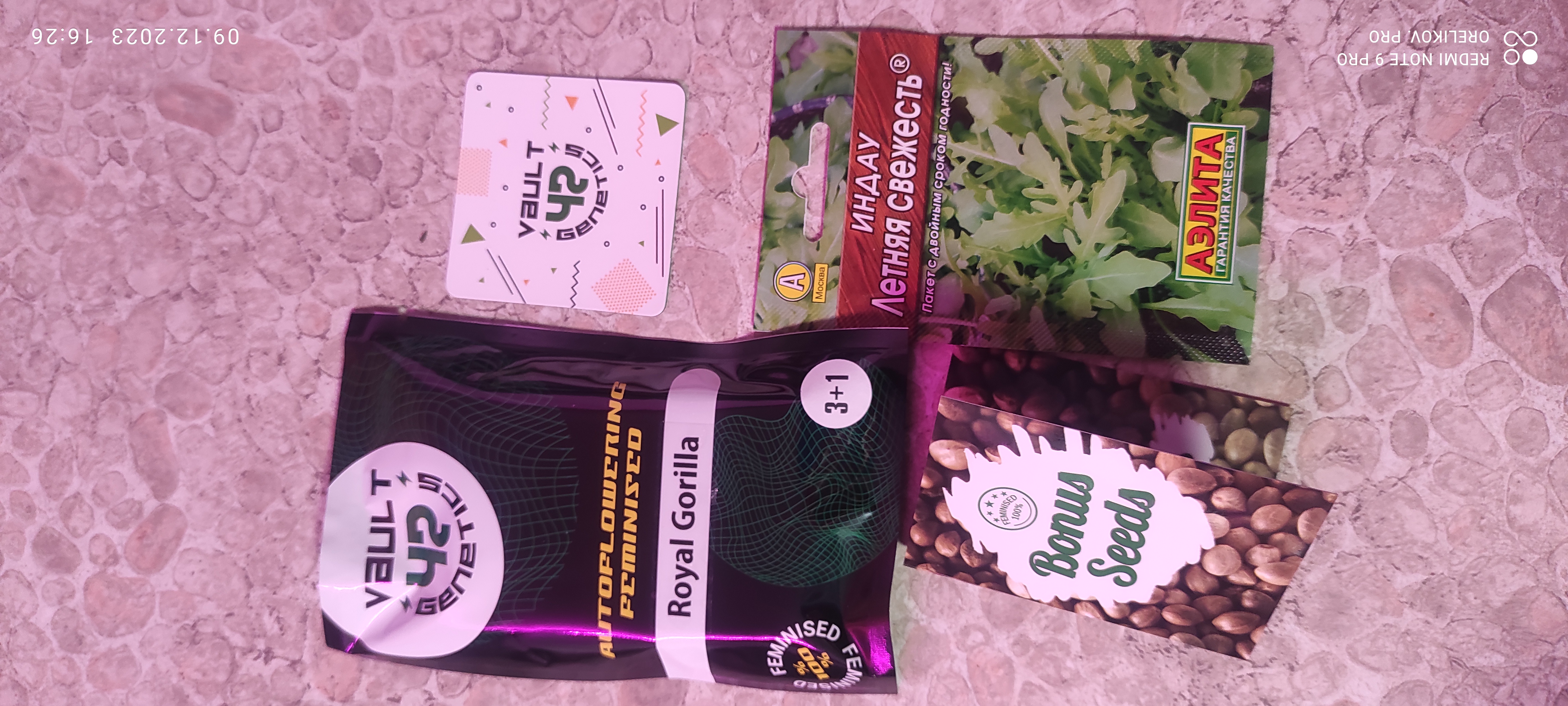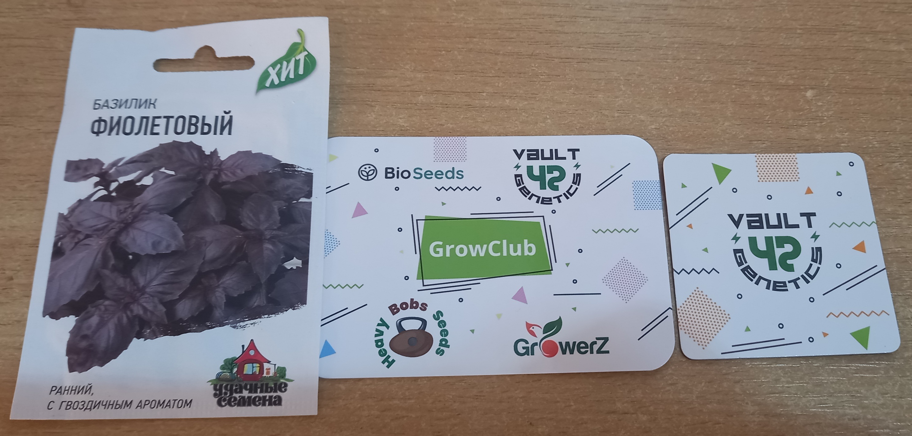 Но, вроде все закончилось, и заветный пакет у меня дома. В комплекте - сам заказ, бонус из четырёх семян от магазина (среди которых вижу, как минимум, одно - фуфловое. Доходяжка мелкая), семена фиолетового базилика (прям мой любимый, серьёзно!), календарик посевной и магнитик от сидбанка основного заказа. Набор стандартный. Как везде.